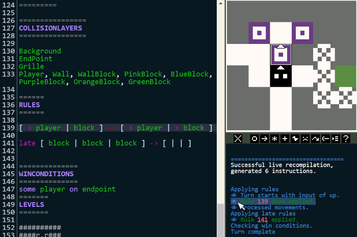 Changes are indicated with black+white (or your custom background/text colours) outlined boxes. In the above example, a new movement has been added to the indicated tile by the rule on line 139.